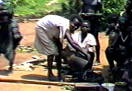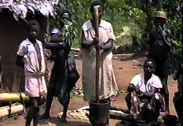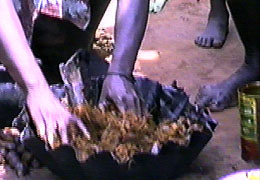 cortara un racimo que tirara al suelo, y acarreara hasta el "Kinu" (especie de mortero) |