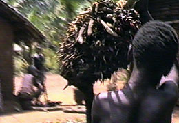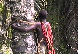 Palmera del aceite, el hombre subira hasta su copa, con bastante temor por si arriba esta la cobra, la mamba negra, una de las serpientes ("ñoka") mas venenosas de Africa |